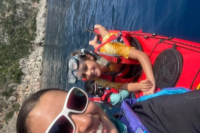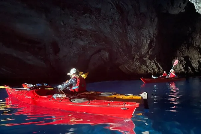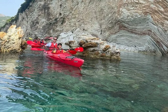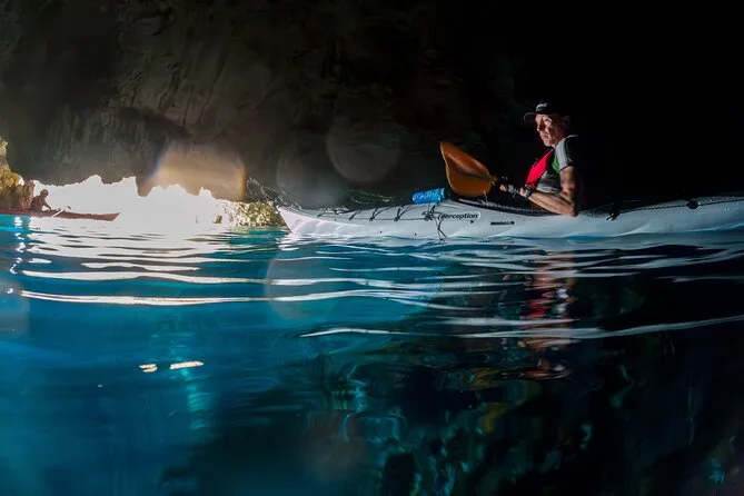Remerai da Mikros Gialos lungo la costa frastagliata di Lefkada con una guida locale, entrerai in kayak nella luminosa Blue Cave, farai snorkeling nelle acque limpide di Rouda Bay e condividerai uno snack greco semplice su rocce riscaldate dal sole. Mezza giornata che ti lascia la pelle salata e il cuore tranquillo, per scoprire la pace del Mar Ionio.