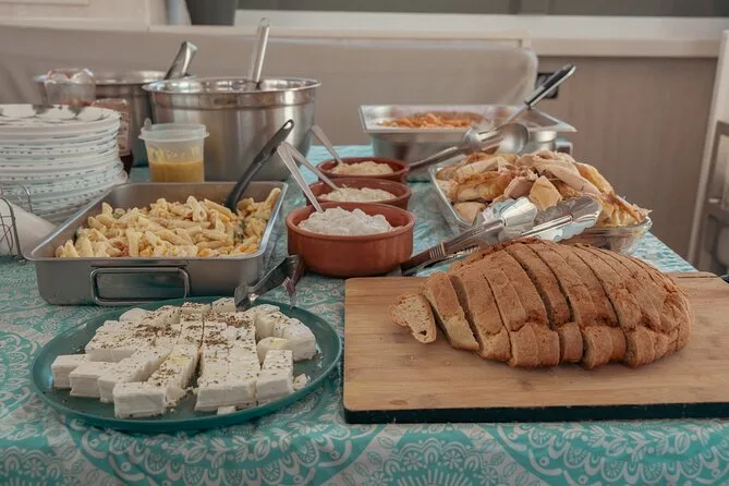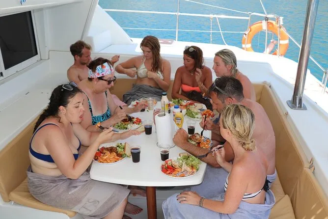 La giornata include panini per colazione mentre lasci Mandraki Harbor, tutte le bevande (bibite, birra, vino bianco), pranzo in stile mediterraneo ancorati vicino ad Afandou Beach, frutta fresca durante tutto il viaggio, uso dell’attrezzatura per lo snorkeling per ogni sosta bagno alla Baia di Anthony Quinn e alle sorgenti di Kallithea — inoltre acqua in bottiglia sempre a disposizione e servizi igienici a bordo per il massimo comfort tra una nuotata e l’altra.
