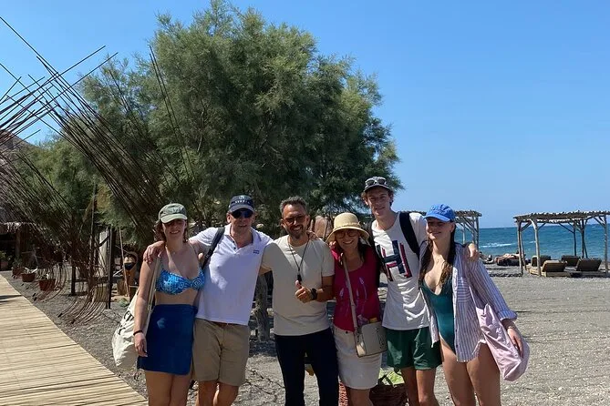 La Spiaggia Rossa sembrava quasi finta — scogliere rosso ruggine contro il blu del mare, pezzi di sabbia nera attaccati ai miei sandali. Non è proprio il posto giusto per nuotare, ma camminare su quelle rocce è come essere su un altro pianeta. Proprio lì vicino c’è Akrotiri: mura antiche mezzo sepolte dalla polvere, silenzio rotto solo dai nostri passi e dalla voce di Eleni che spiegava come vivevano qui migliaia di anni fa. A quel punto la testa mi girava per la storia e il sole, così ci siamo seduti un attimo ad ascoltare le cicale prima di tornare indietro.