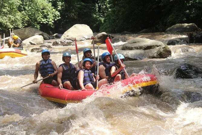 Dopo aver tolto il casco (i miei capelli erano un disastro), è calato un silenzio prima della seconda parte: il rafting sul fiume Ayung. Si sentivano le cicale e qualcuno che tagliava verdure in una cucina vicina. Il fiume sembrava più calmo di quanto immaginassi, ma appena ci siamo lanciati è iniziato uno spruzzo continuo e tante risate. La guida ci urlava “remate!” proprio quando io mi distraevo guardando una cascata che scendeva su rocce nere. A un certo punto ci ha fatto notare delle incisioni sulla parete della roccia — storie antiche scolpite che avrei perso se non ci avesse fatto rallentare.