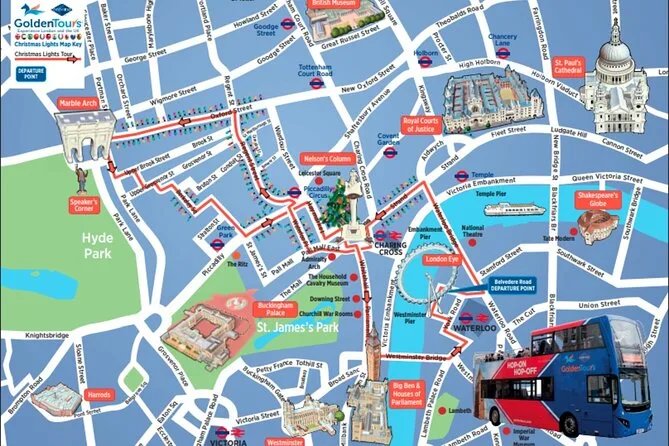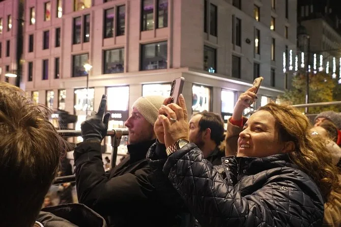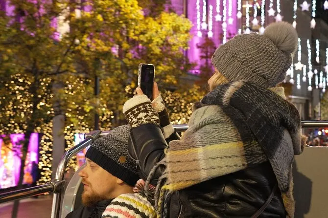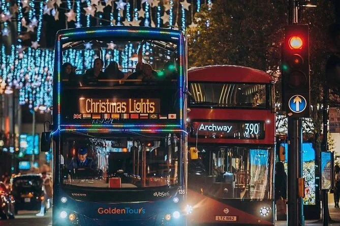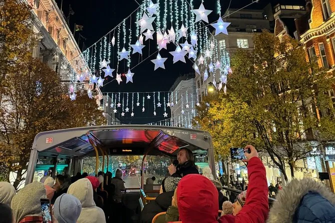 La tua serata comprende un posto su un bus scoperto nel centro di Londra circondato da luci natalizie, commento guidato in inglese per tutta la durata di 60-90 minuti, e un facile accesso vicino al London Eye con ritorno al punto di partenza a fine tour.