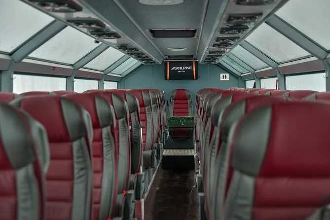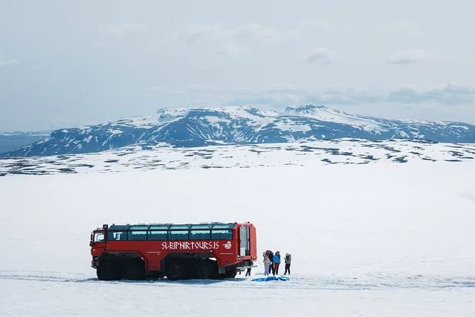 Il tuo giorno include il trasferimento in Highland bus da Gullfoss alla base del monster truck Sleipnir, un tour guidato di 3–4 ore al ghiacciaio Langjökull a bordo di uno dei più grandi truck d’Islanda con finestre panoramiche, l’ingresso a una vera grotta di ghiaccio (ramponi inclusi), WiFi a bordo e accesso ai servizi igienici durante il viaggio, con ritorno alla cascata Gullfoss alla fine.