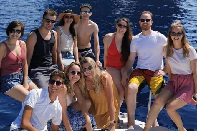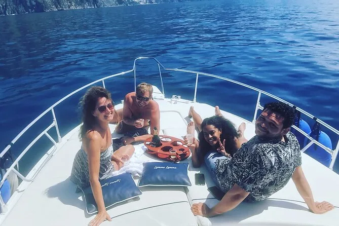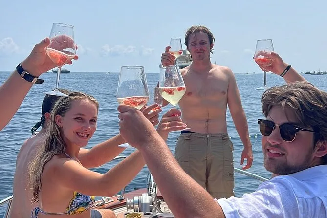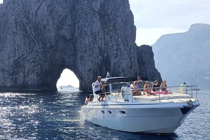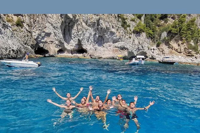 La giornata include acqua in bottiglia e snack a bordo (più un po’ di vino locale o birra se vuoi), uso dell’attrezzatura per snorkeling per tuffarti subito nelle acque limpide vicino alle grotte di Capri, docce per sciacquarti dopo il bagno, giubbotti di salvataggio per la sicurezza di tutti, più 3-4 ore di tempo libero sull’isola — e se preferisci, puoi aggiungere il pickup in hotel per arrivare e tornare senza pensieri.