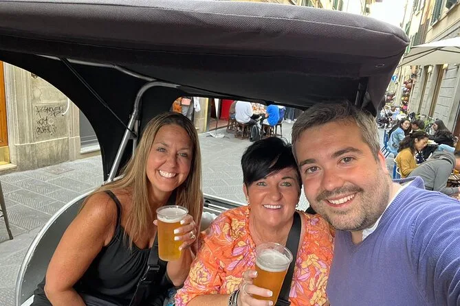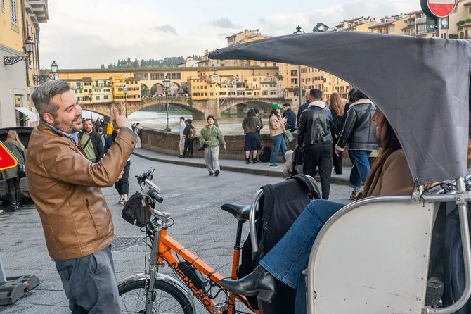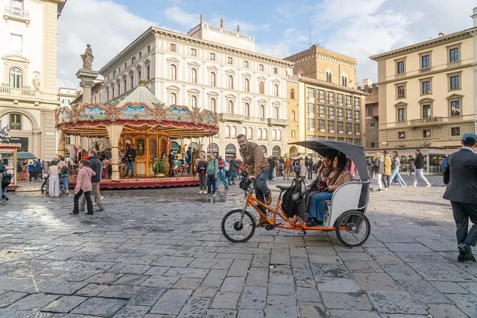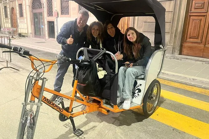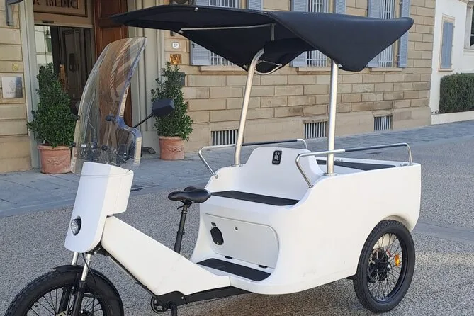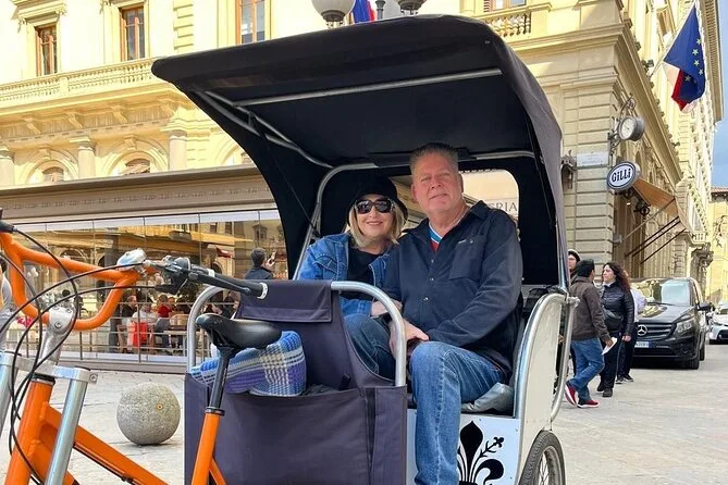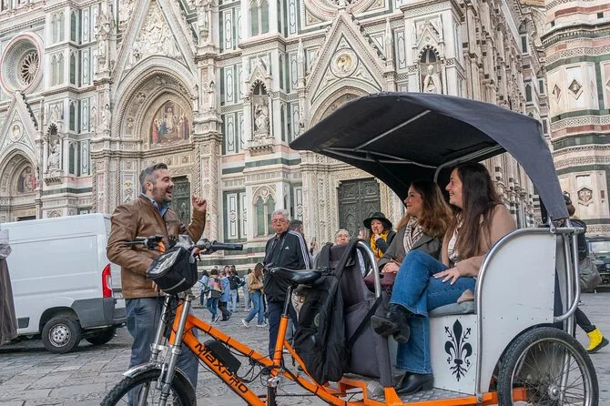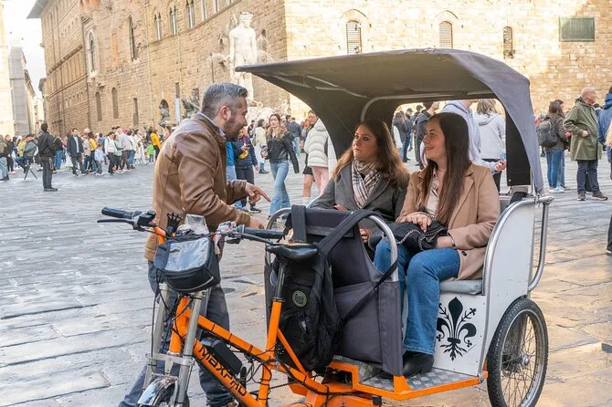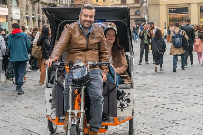 La tua giornata include il trasporto privato in risciò elettrico con un autista locale che ti verrà a prendere dove preferisci—hotel, piazza del centro o Santa Maria Novella—e ti porterà ovunque nel centro di Firenze durante il tempo prenotato. Le soste sono completamente libere, così puoi fermarti per foto o uno spuntino quando vuoi, prima di terminare il giro a Santa Croce o in un altro punto che preferisci.
