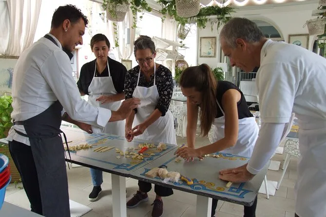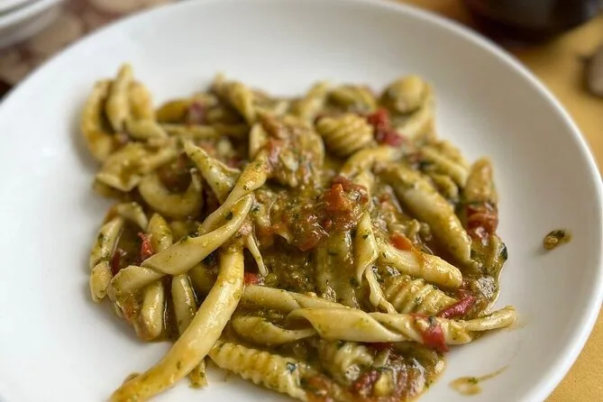 La tua giornata comprende lezioni pratiche di cucina siciliana con lo chef Mimmo sulla spiaggia di Giardini Naxos, tutti gli ingredienti forniti (compresi prodotti locali come i pistacchi di Bronte), degustazione di vini abbinata a focaccia e formaggi, pranzo completo con pasta e pesce fatti da te, acqua minerale, pausa caffè o tè, piccoli cannoli tradizionali con limoncello per dessert — e anche grembiule e certificato da portare a casa (con eventuali tracce di farina).