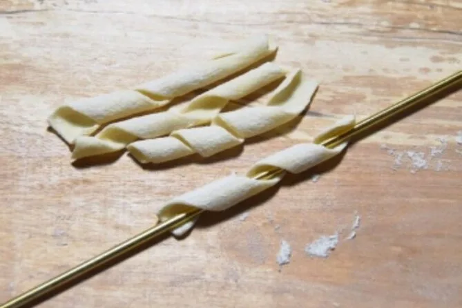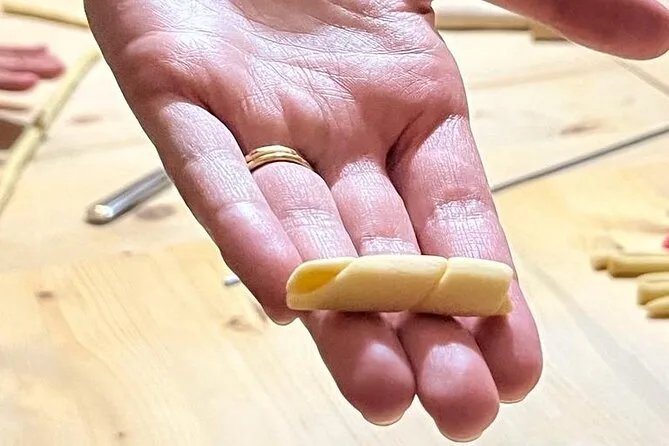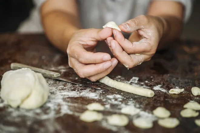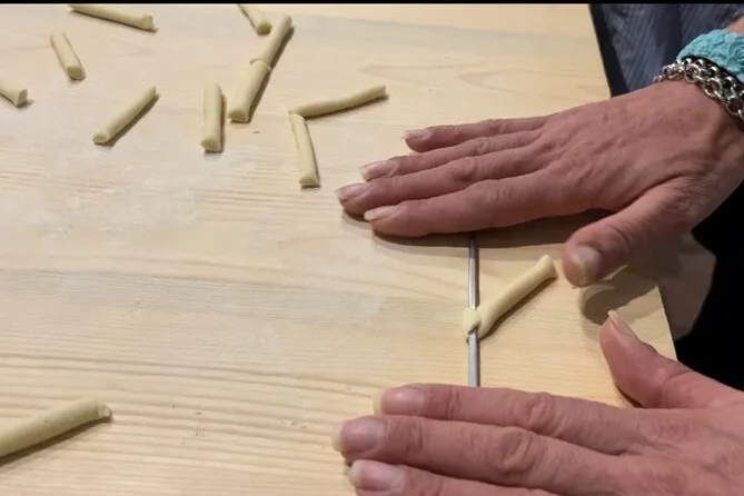 Fare le orecchiette non è così semplice come sembra su YouTube. L’impasto è morbido ma testardo, e le piccole orecchie di pasta continuavano ad attaccarsi alle dita. Anna aveva un modo tutto suo di arrotolarle col pollice che sembrava magia — dice che sua nonna glielo ha insegnato quando aveva cinque anni. Ci siamo alternati usando il ferretto per i maccheroni, un bastoncino di metallo sottile che crea tubetti perfetti se non premi troppo (io ho premuto troppo). Ormai eravamo tutti impolverati di farina e ridevamo ogni volta che qualcuno faceva cadere un pezzo a terra.