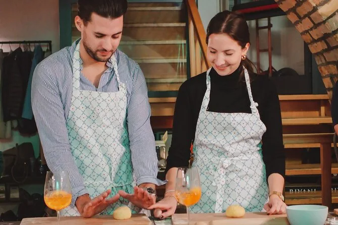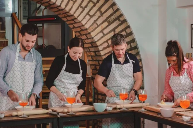 «A Roma non ci fidiamo mai di uno chef magro», ha sorriso Marco porgendomi il primo Aperol spritz. Ho riso anch’io, ma dopo aver visto quanta farina ho sparso sulla maglietta (e sul pavimento), ho capito il perché. La cucina era già viva quando siamo arrivati: il tintinnio dei bicchieri, quel profumo agrumato dello spritz nell’aria e una playlist di vecchie canzoni italiane in sottofondo. Marco, chef e comico non ufficiale del gruppo, ci ha insegnato a far roteare le fette d’arancia nel bicchiere prima ancora di toccare l’impasto. Sembrava più di stare a casa di un amico che seguire una lezione.