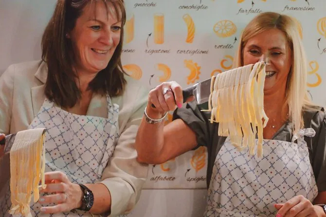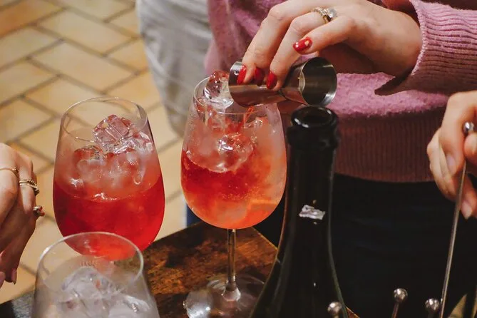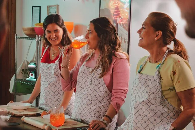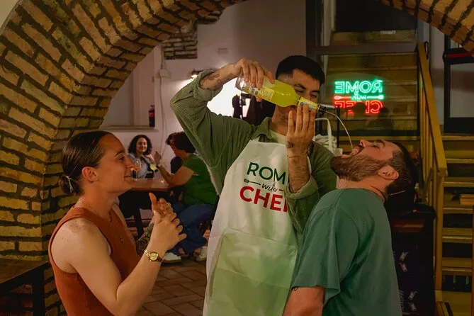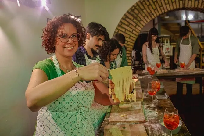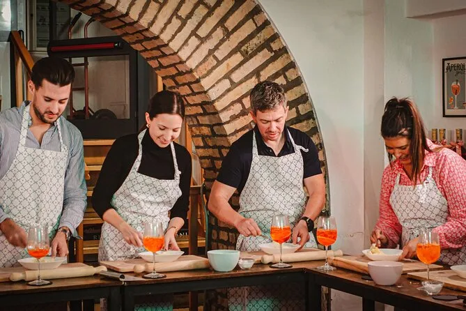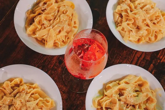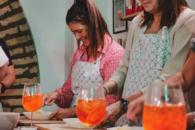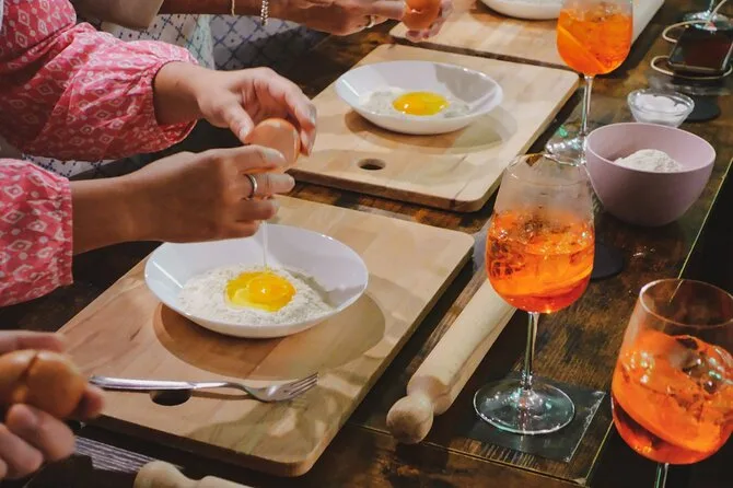 Il pomeriggio include una lezione pratica di pasta fresca guidata da uno chef locale vicino al Colosseo, tre spritz diversi preparati da un mixologist professionista durante la cucina, acqua o bibite illimitate per tutta la durata, più le ricette digitali da portare a casa per rifare tutto quando vuoi.