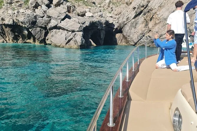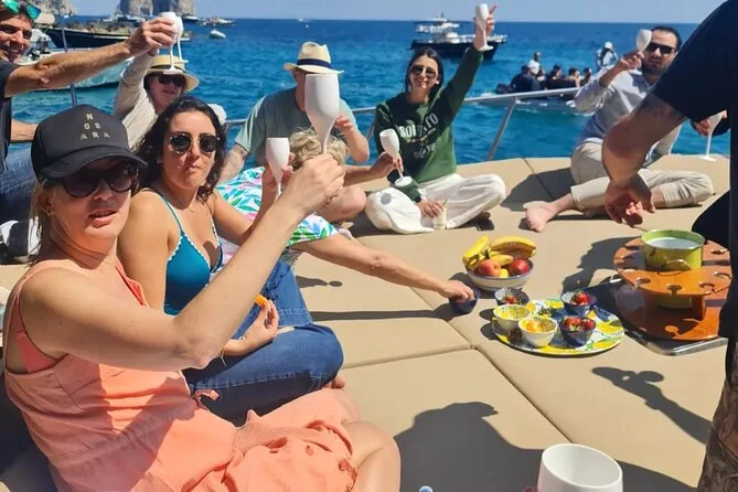 Quasi mancavo il molo a Sorrento perché ero distratto da un cane che inseguiva i piccioni vicino al porto — tipico me. Ma Antonio, il nostro skipper, ci ha solo sorriso e fatto cenno come se fosse una scena vista mille volte. La barca era più piccola di quanto immaginassi (in senso positivo), così si sentivano davvero le voci di tutti sopra il rumore del motore, e si percepiva l’odore del mare prima ancora di partire. Qualcuno ha subito distribuito acqua fresca — un gesto molto apprezzato visto che il sole già scaldava.