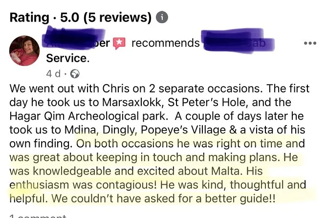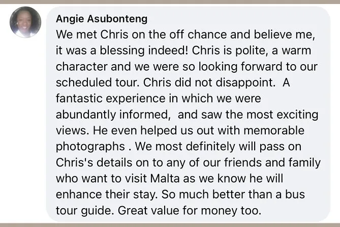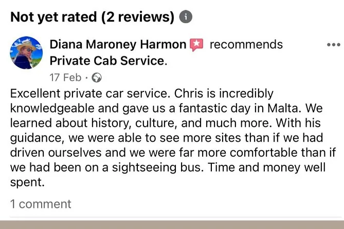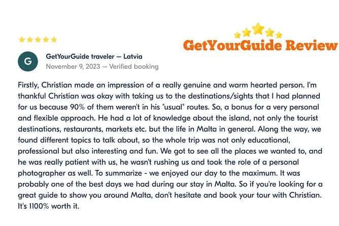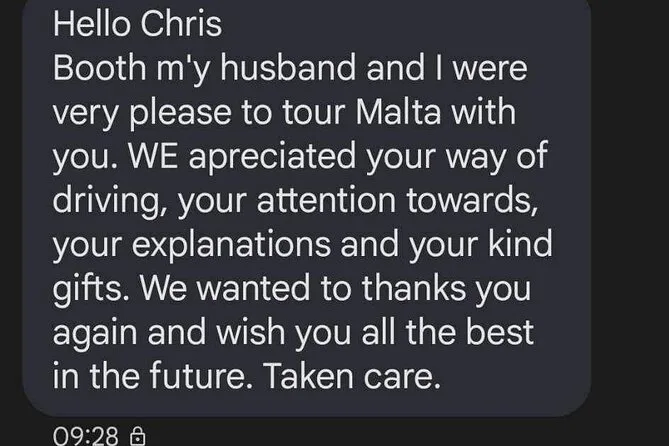 Non so ancora come siamo riusciti a vedere così tanto in un solo giorno partendo da Valletta o Sliema — forse perché il nostro autista ha tenuto il ritmo senza mai farci correre. Aveva sempre dell’acqua fresca pronta e sembrava capire esattamente quando avevamo bisogno di una pausa o volevamo fermarci più a lungo. Il viaggio di ritorno è stato silenzioso, tranne per qualcuno che russava piano sul sedile dietro (non faccio nomi). A volte non serve che tutto vada perfetto; basta qualcuno del posto che ci tenga abbastanza da mostrarti la sua casa.