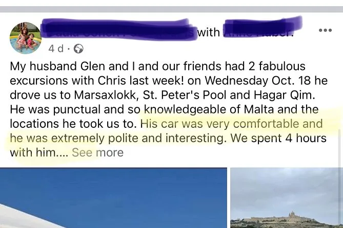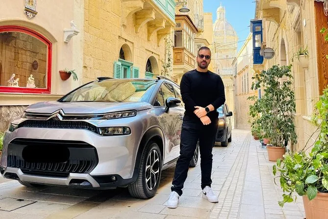 Il tuo giorno include il pick-up dal tuo hotel o alloggio in qualsiasi zona di Malta, acqua in bottiglia durante tutto il viaggio, trasporto confortevole in una Citroën C3 Aircross con aria condizionata, più soste flessibili in luoghi come le Three Cities, il porto di Marsaxlokk, le grotte marine della Blue Grotto (gita in barca opzionale), i templi megalitici di Ħaġar Qim, la città vecchia di Mdina, la cupola della chiesa di Mosta e panorami mozzafiato sulla costa di Dingli, per riportarti infine in sicurezza al punto di partenza.