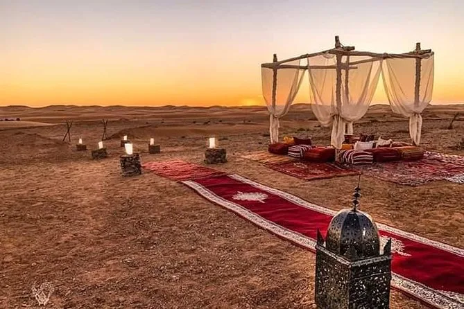 Trasporto privato con aria condizionata, autista/guida parlante inglese, pick-up e drop-off in hotel o riad, acqua in bottiglia durante il viaggio, cavalcata in cammello fino al campo e ritorno, cena sotto le stelle del Sahara, colazione al campo e pernottamento in una vera tenda berbera—tutto organizzato per farti vivere ogni momento senza pensieri.