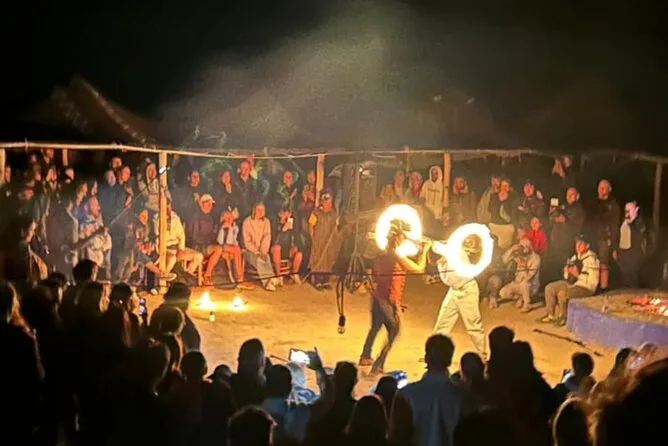 Sì, musica dal vivo berbera, balli e uno spettacolo di fuoco durante la cena nel campo nel deserto.