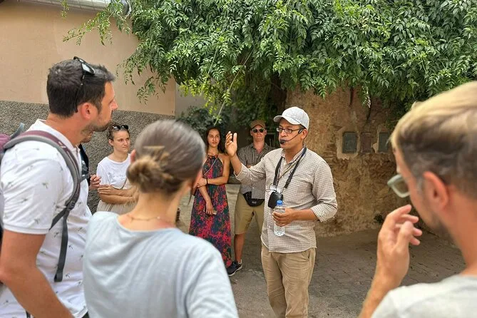 Abbiamo incontrato la nostra guida proprio fuori dalla Moschea Koutoubia — quel minareto domina davvero tutto intorno. Il richiamo alla preghiera si diffondeva nell’aria, mescolandosi al profumo di arance proveniente da una bancarella vicina. Avevo visto foto di Marrakech, ma nulla ti prepara davvero a come si sente la città sotto i piedi. Youssef, la nostra guida, raccontava storie con una naturalezza incredibile mentre camminavamo; indicava piccoli dettagli nelle pietre che altrimenti mi sarebbero sfuggiti. Rideva quando cercavo di pronunciare “Mouassine” (non ci sono mai riuscito), e in qualche modo questo mi ha fatto sentire subito a mio agio.