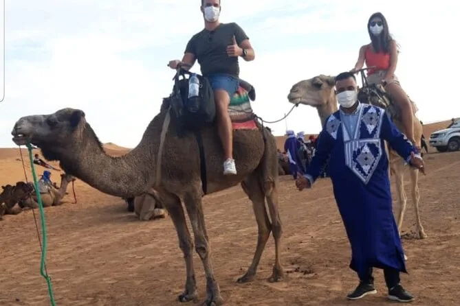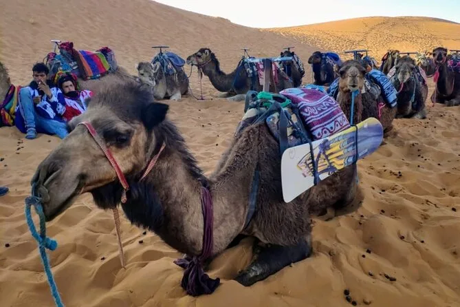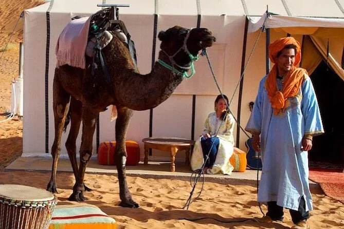 Il viaggio comprende il pick-up dal tuo riad o hotel a Marrakech con minibus climatizzato (carburante incluso), tutti i trasferimenti tra le tappe attraversando i passi dell’Atlante, una notte all’Hotel Saghro (o simile) a Tinghir con cena e colazione, una notte in campo tendato berbero a Merzouga con cena, colazione e musica con tamburi intorno al fuoco, escursioni guidate in cammello al tramonto e all’alba (un cammello a persona), divertimento con sandboarding sulle dune di Erg Chebbi e tanto tè alla menta lungo il percorso, con rientro a Marrakech in serata.
