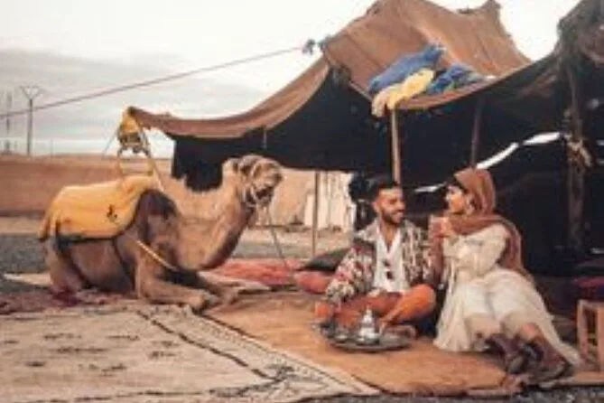 Attraversa il deserto roccioso di Agafay vicino a Marrakech in cammello, prova il quad con guida locale, ammira il tramonto sulla vasta distesa, poi gusta una cena berbera con musica dal vivo e spettacolo di fuoco. Risate, sapori nuovi e momenti di pace sotto stelle indimenticabili ti aspettano.
