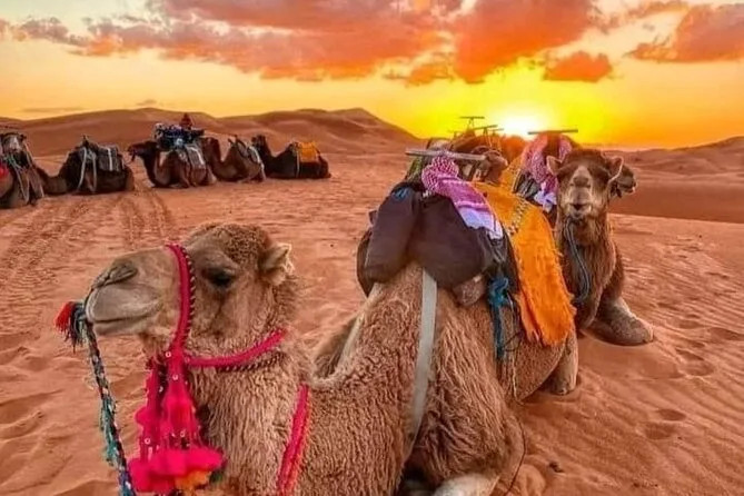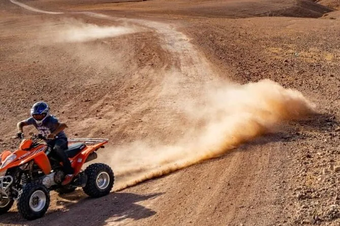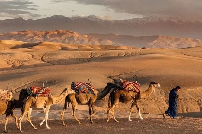 Il tuo giorno include il pick-up e il ritorno in hotel a Marrakech con trasporto climatizzato, mezz’ora di quad (due persone per quad), un’escursione guidata in cammello al tramonto nel deserto di Agafay, cena a buffet berbera con tè, più musica dal vivo e spettacolo di fuoco prima del rientro in città.