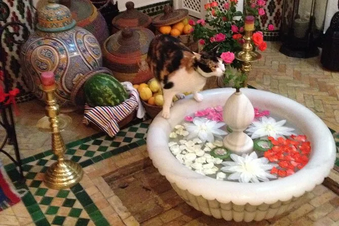 Potrai gustare piatti tradizionali marocchini come pane piatto, olive e specialità locali durante la pausa pranzo.