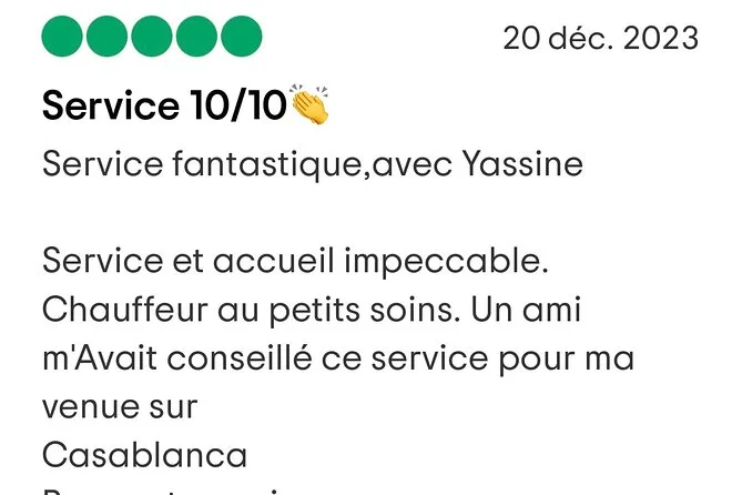 All’arrivo a Casablanca ti aspetterà un autista locale esperto con un cartello col tuo nome—niente stress o trattative. Goditi un viaggio tranquillo in un’auto pulita e climatizzata con WiFi e acqua inclusi. Piccoli dettagli come l’aiuto con i bagagli o consigli su dove mangiare rendono l’arrivo molto più semplice.