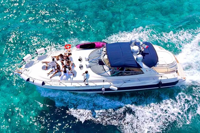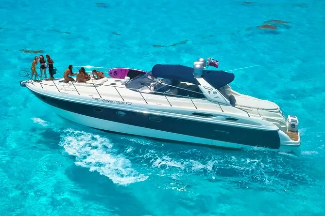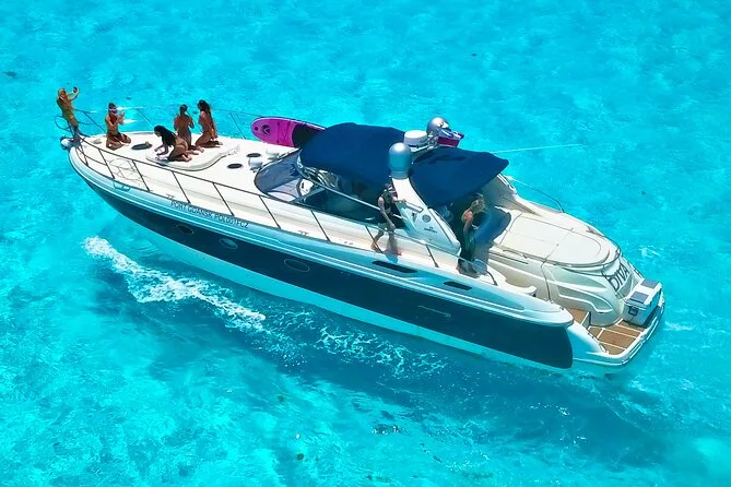 Il tuo giorno comprende il noleggio privato di uno yacht italiano da 60 piedi con equipaggio completo (capitano, due marinai e steward), uso delle attrezzature di sicurezza, oltre a maschere e pinne per lo snorkeling e paddleboard se vuoi. Avrai tre sacchi di ghiaccio pronti insieme a tante bottiglie d’acqua e bibite — porta solo gli snack o le bevande extra che preferisci prima di partire dalla marina di Cancun verso il mare aperto o Isla Mujeres, a seconda del percorso scelto.