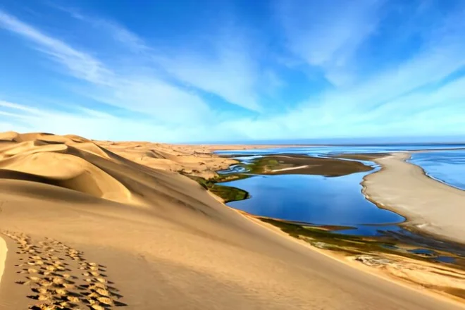 Potrai ammirare tanti uccelli nella laguna e animali selvatici che si muovono liberi nel deserto del Namib.