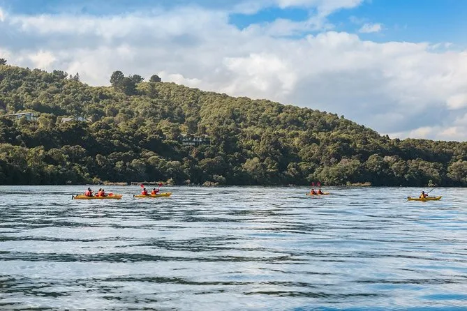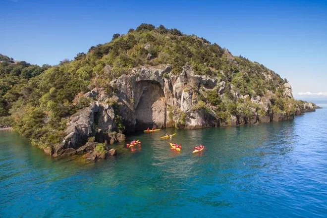 Gita in kayak sul Lago Taupo alle incisioni Maori con nuoto e racconti