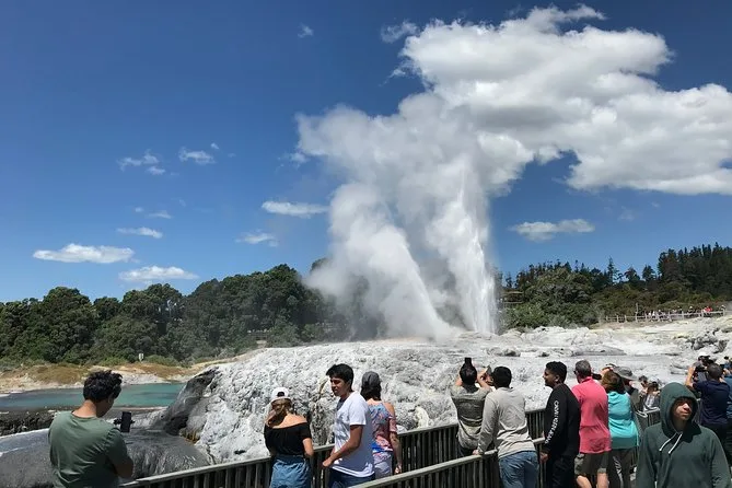 Vedrai il geyser Pohutu in eruzione, pozze di fango bollente, dimostrazioni di intaglio e tessitura Maori, kiwi nel centro di conservazione e uno spettacolo culturale con haka.