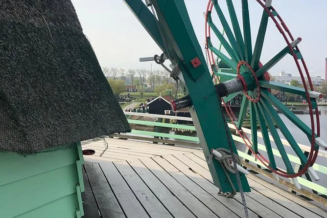 Hai presente quel momento in cui scendi dall’auto a Zaanse Schans e l’aria profuma di erba e qualcosa di dolce — forse waffle? È così che è iniziata la nostra giornata. La nostra guida, Pieter, ci ha subito chiamati verso i mulini. Avevo visto foto, ma stare lì, sentire il cigolio delle pale e toccare il legno umido dentro il mulino della vernice (quello di Rembrandt, pare!), è stato tutto molto… vero. C’era un gruppo di bambini con impermeabili colorati che correvano e urlavano in olandese — ho capito forse una parola: “Molen”, che credo significhi mulino.