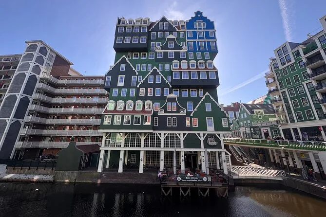 Entrare a Zaanse Schans è stato come aprire una di quelle scatole di biscotti che mia nonna usava per conservare i bottoni. I mulini sono davvero in funzione — se ti avvicini senti l’odore di segatura e vernice. Abbiamo avuto tempo per girare con calma e prendere qualcosa da mangiare (io ho scelto i poffertjes — piccole frittelle immerse nel burro). Li si è fatta una risata quando ho provato a ordinare in olandese; probabilmente ho fatto un disastro, ma ha detto che era “carino”. Dopo abbiamo fatto una breve sosta a Zaandam per vedere quelle strane case impilate trasformate in hotel, prima di tornare verso Amsterdam.