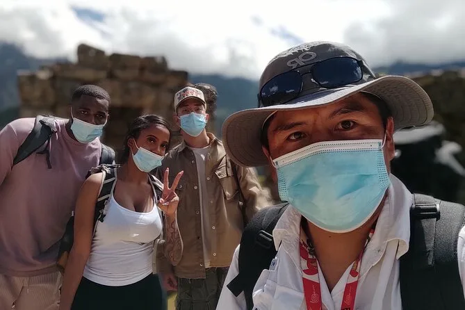 Una guida locale multilingue accompagna il tour a piedi nella cittadella di Machu Picchu.