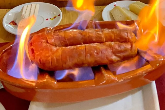 Assaggerai panini di maiale, frittelle di baccalà, insalata di ceci con baccalà, formaggio, pane, olive, lupini, samosa, chorizo, zuppa e torta alla crema.