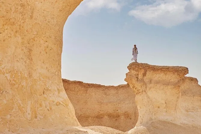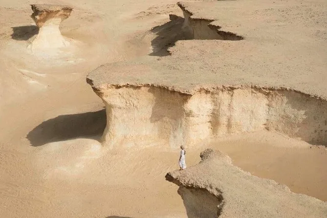Visiterai la Riserva Naturale di Brouq con le sculture di Richard Serra, il Forte di Zekreet, la formazione delle Mushroom Rocks e una pista di corsa per cammelli.