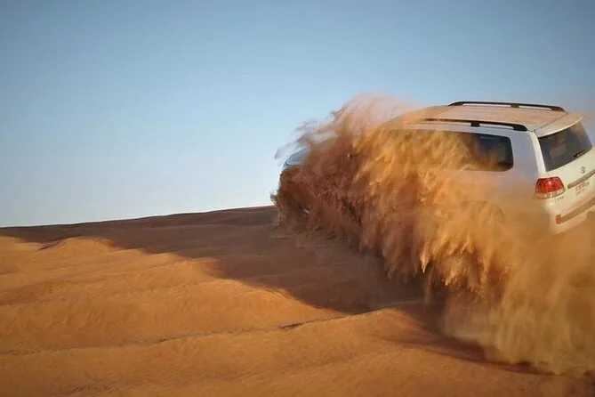 Il tuo giorno include il pick-up e il rientro in hotel con veicolo 4x4 climatizzato, acqua in bottiglia durante tutto il percorso, una pausa tè speziato mentre la guida prepara il dune bashing, tutte le attività di dune bashing, giri opzionali in quad o dune buggy se selezionati in fase di prenotazione, più un tranquillo giro in cammello prima di goderti il tempo sulla riva di Khor Al Udaid.