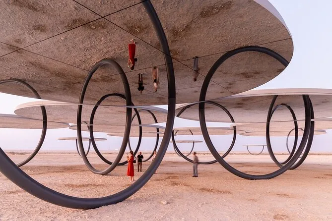 L’ultima fermata ci ha portati fino all’estremità nord-est del Qatar. Qui la brezza marina è più forte, con un sapore salato che ti resta sulle labbra. Abbiamo trovato l’installazione artistica di Olafur Eliasson—un’esplosione di colori e forme in mezzo a tutto quel beige deserto. È strano e bello allo stesso tempo, con il deserto alle spalle e il Golfo davanti.