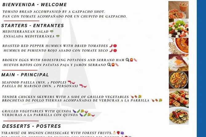 Eravamo solo una decina a bordo — una coppia che festeggiava qualcosa (continuavano a bisbigliare), una famiglia con due bambini che provavano a fare paddle surf (con risultati alterni), e io che mi godevo tutto. Gli snack sono arrivati subito: jamón, manchego, un po’ di hummus con verdure croccanti. Niente di sofisticato ma perfetto dopo una giornata calda in città. Se scegli l’upgrade cena, c’è uno chef che griglia pesce fresco proprio lì — io non l’ho preso stavolta, ma l’odore mi ha fatto pentire subito.