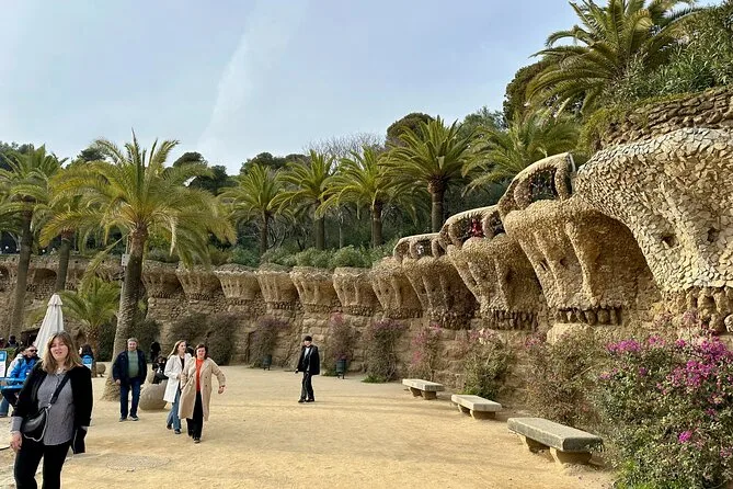 Il tuo giorno include ingresso salta la fila a Park Güell a Barcellona, un tour a piedi di 75 minuti con una guida ufficiale autorizzata che racconta storie e storia tramite cuffie personali, così non perderai nemmeno una parola anche se ci sono molte persone intorno.