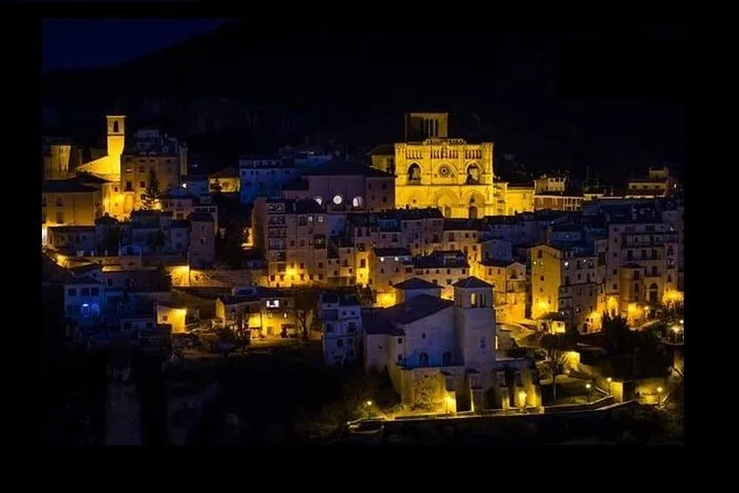 Cuenca si trasforma in un luogo misterioso mentre cammini per le sue strade illuminate dopo il tramonto. Ammira facciate antiche che si accendono, attraversa un ponte di ferro vertiginoso e ascolta storie locali che ti resteranno nel cuore, soprattutto quando vedrai le Case Sospese brillare nel cielo notturno.