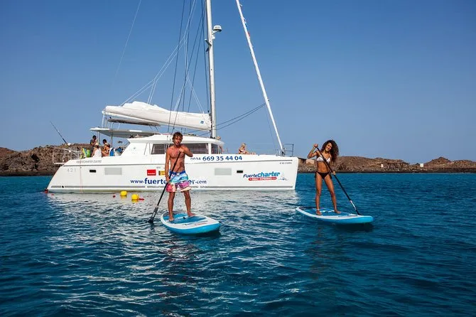 Il tuo giorno include pick-up in hotel o porto nell’area di Corralejo, una navigazione guidata in catamarano con soste per kayak, paddleboard (SUP), attrezzatura per snorkeling gratuita, pranzo a base di paella di frutti di mare appena cucinata a bordo con bevande illimitate (birra, vino, bibite), più foto scaricabili del viaggio prima del comodo rientro al termine della tua avventura di quattro ore.