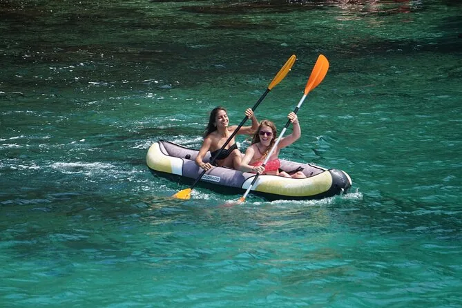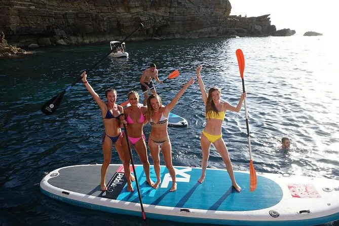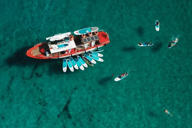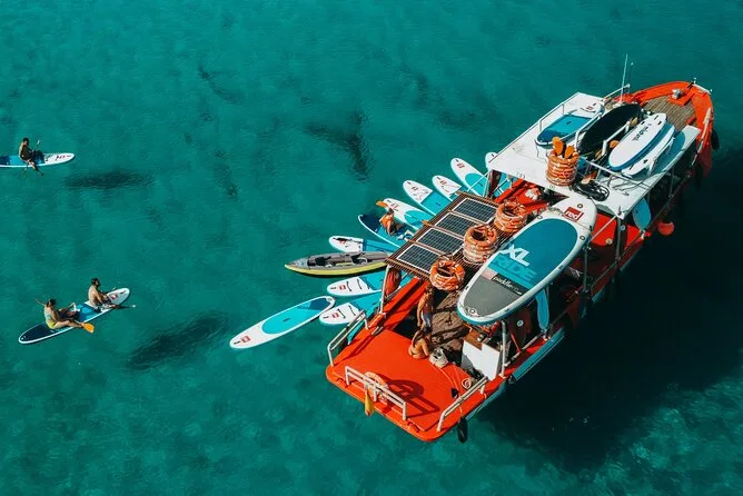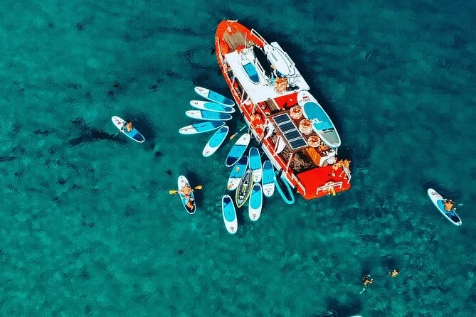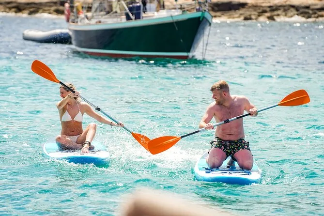 Il pomeriggio include tutte le bevande (birra, vino, sangria, champagne), tanta frutta fresca come ananas e arance, l’uso di paddle board e kayak, oltre all’attrezzatura per lo snorkeling — tutto guidato da una simpatica guida locale dal porto di San Antonio. A bordo è disponibile anche il Wi-Fi prima del ritorno dopo tre ore in mare.