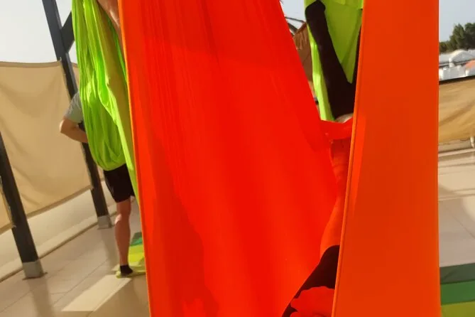 Abbiamo iniziato piano, dondolandoci appena per abituarci alla sensazione di stare sospesi. Ana girava tra noi per aiutare — mi ha sistemato la presa una volta e ha riso quando il mio piede si è incastrato («Non preoccuparti, succede a tutte le lezioni!»). La parola chiave è aerial yoga, ma all’inizio sembrava più un gioco che un esercizio. Dopo dieci minuti però le braccia hanno cominciato a bruciare — te ne accorgi solo quando provi a sostenerti e i muscoli iniziano a farsi sentire.