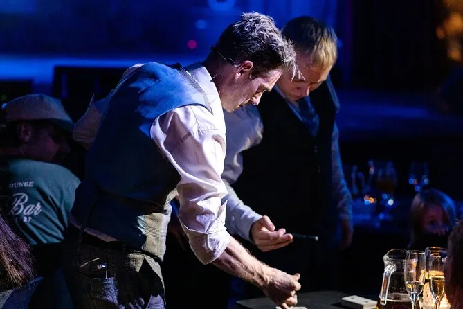 Dentro, l’atmosfera è cambiata — sembrava che tutti trattenessero il respiro. Il mago al nostro tavolo (credo si chiamasse Jamie?) ha fatto comparire una carta dietro la mia orecchia e ha fatto l’occhiolino a mia figlia. Lei è convinta che sia davvero magia. La cena è arrivata in fretta: prima le tapas, poi ho scelto il baccalà perché qualcuno a un altro tavolo lo aveva definito “davvero speciale”. Lo spettacolo è iniziato prima ancora che arrivasse il dolce. Le ombre proiettate sul muro si sono trasformate in uccelli, poi di nuovo in mani. Qualcuno è scappato dalle manette in meno di un minuto — non ho idea di come facciano.