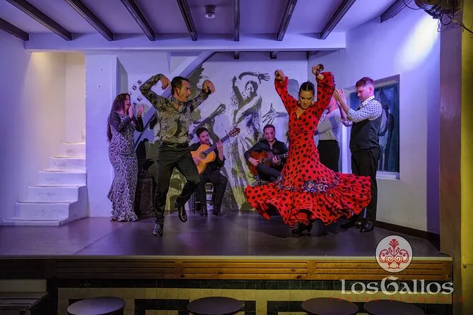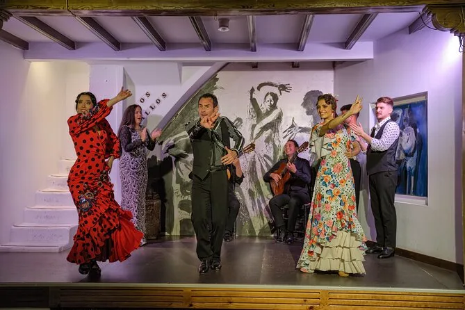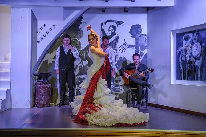 La tua serata include un posto riservato al tablao Los Gallos per assistere a una performance dal vivo di otto artisti acclamati—tre ballerini, tre cantanti e due chitarristi—nel quartiere storico di Santa Cruz a Siviglia. Il trasporto non è incluso, ma ci sono fermate di mezzi pubblici nelle vicinanze; l’accesso al locale è adatto a sedie a rotelle, eccetto i bagni.