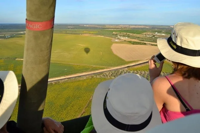 Vola sopra la campagna di Siviglia in mongolfiera con una guida locale, ammirando cavalli e girasoli da 450 metri di altezza. Dopo l’atterraggio, goditi una ricca colazione andalusa e un brindisi con cava—momenti di meraviglia e allegria che porterai con te a lungo.