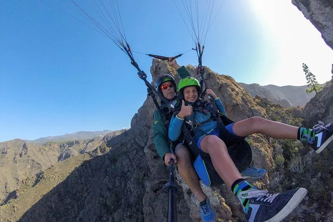 Continuavo a guardare giù verso il Barranco del Infierno, pensando a quanto tutto sembrasse piccolo — e non eravamo nemmeno ancora decollati. Li mi ha agganciato all’imbrago e mi ha spiegato di nuovo come correre al suo via. Non è stato elegante (quasi inciampo su me stesso), ma all’improvviso eravamo in volo. Il vento mi schiacciava la faccia e c’era un silenzio strano — non un silenzio totale, ma più soffice di quanto immaginassi, solo il fruscio del tessuto e Li che indicava: “Quella è La Gomera laggiù,” diceva, indicando una macchia blu all’orizzonte. Ho provato a dirgli “gracias” per calmarmi; probabilmente l’ho storpiato.