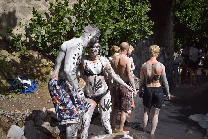 Dopodiché siamo andati alle sorgenti sulfuree del vulcano accessibile in auto. Si sente l’odore prima ancora di vedere qualcosa—un po’ come uova sode lasciate al sole troppo a lungo, ma in qualche modo non fastidioso. Ci siamo spalmati il fango (Felix diceva che ti fa sembrare dieci anni più giovane; penso scherzasse) e l’abbiamo lasciato asciugare mentre il vapore ci avvolgeva. La pelle dopo sembrava stranamente morbida, anche se con tutta quella pasta grigia sembravo un po’ ridicolo. Il pranzo era semplice ma buono—riso, pollo e una salsa piccante che ancora non riesco a pronunciare. C’era una signora anziana che vendeva frutta lungo la strada, mi ha dato una fetta di ananas dorato e ha sorriso quando quasi la facevo cadere.