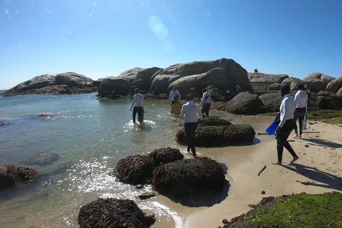 Non sono un nuotatore esperto, quindi avere vicino la boa di sicurezza mi ha fatto rilassare e godermi davvero il momento, fluttuando insieme agli altri. Le guide restavano sempre vicine, chiamandoci ogni volta che scoprivano qualcosa di speciale — come un polpo nascosto in una crepa o piccole conchiglie di abalone sepolte nella sabbia. Dopo circa un’ora in acqua, siamo tornati a riva per un breve resoconto e ci siamo cambiati proprio sulla spiaggia. Alcuni sono andati via in auto, ma io sono tornato con il gruppo a Muizenberg, ancora emozionato per tutto quello che avevamo visto.