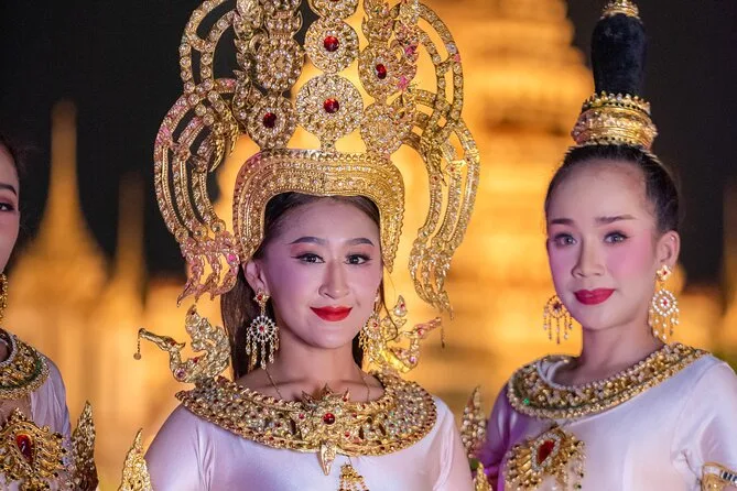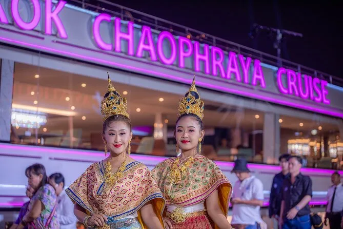 La tua serata include l’imbarco al molo di Asiatique per una crociera cena di due ore sul fiume Chao Phraya con posti panoramici sul rooftop (se prenotati), drink di benvenuto, bibite e acqua a volontà, un buffet internazionale con specialità thailandesi e opzioni vegetariane su richiesta, musica dal vivo e spettacoli di danza tradizionale thailandese — tutto prima del rientro a riva in tarda serata.