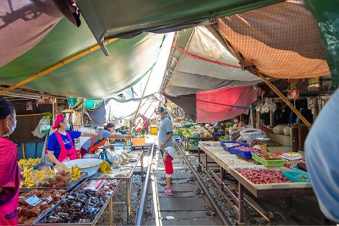 Il viaggio verso il mercato ferroviario di Maeklong è durato circa un’ora? Difficile dirlo, mi sono addormentato per un po’. Il mercato ferroviario è... beh, è caos al rallentatore. La guida ci ha fatto allineare lungo i binari poco prima di mezzogiorno e all’improvviso tutti hanno iniziato a piegare le tende come se fosse una coreografia. Il fischio del treno è stato forte — niente mezze misure — e poi quel motore rosso brillante è passato strisciando con pochi centimetri di spazio da ogni lato. I venditori non hanno battuto ciglio; un vecchio signore continuava a vendere licheni fino all’ultimo momento prima di dover spostare la bancarella. Ancora oggi penso a quanto fosse normale per loro, mentre per noi sembrava incredibile.