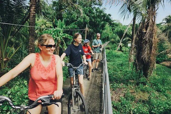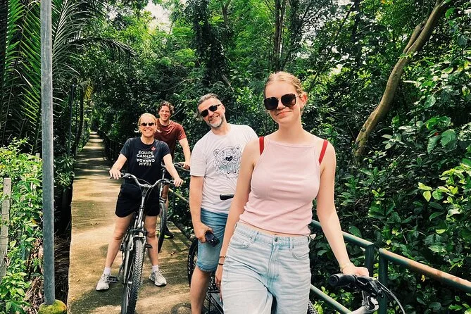 La parte migliore? Attraversare il fiume in barca con le bici — onestamente, non l’avevo mai fatto prima. L’acqua era torbida ma calma, e una brezza fresca è stata un vero sollievo dopo il caldo della città. Dall’altra parte tutto cambiava: pedalavamo sotto alberi enormi, con il frinire delle cicale così forte da dover alzare la voce per parlare. L’aria aveva un profumo di verde — se si può dire così — come foglie bagnate e terra dopo la pioggia.