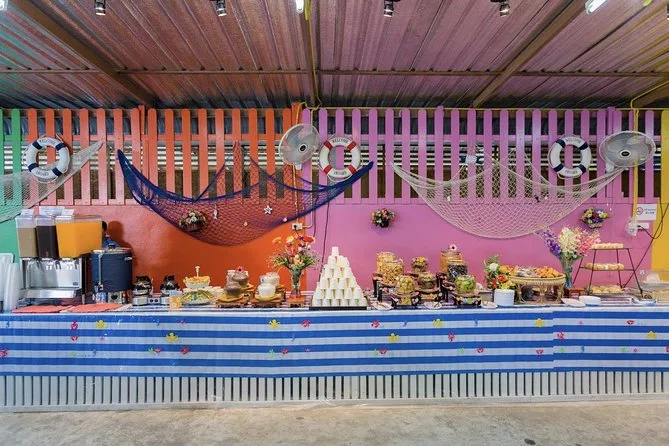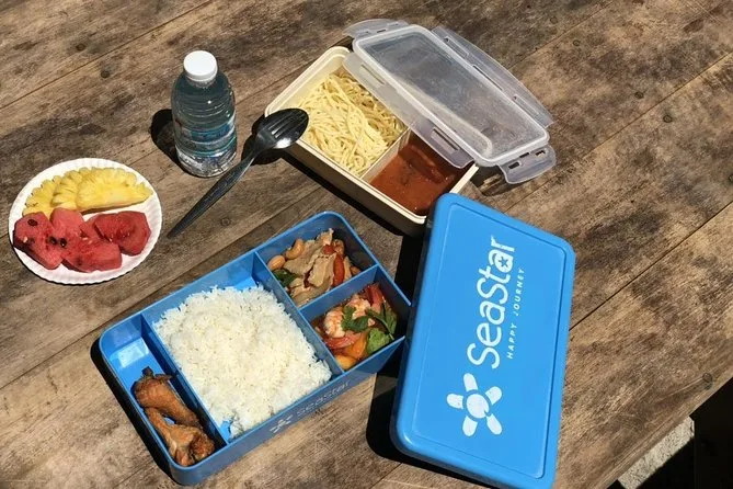 Un pranzo thailandese in scatola con piatti come riso appiccicoso e pollo, servito sulla spiaggia di Princess Bay.
